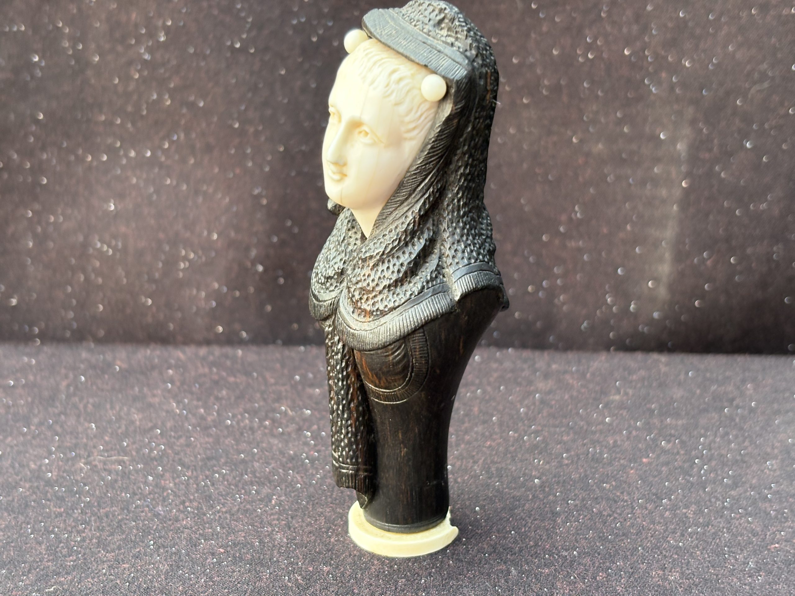 Elegant and decorative antique figurine from the Victorian period, executed as a finely carved female bust. The face is made of ivory, while the body and clothing are carved from dark wood (likely ebony or dark-stained wood). The contrast between the light ivory and the dark wood gives the object a particularly aesthetic and luxurious character.