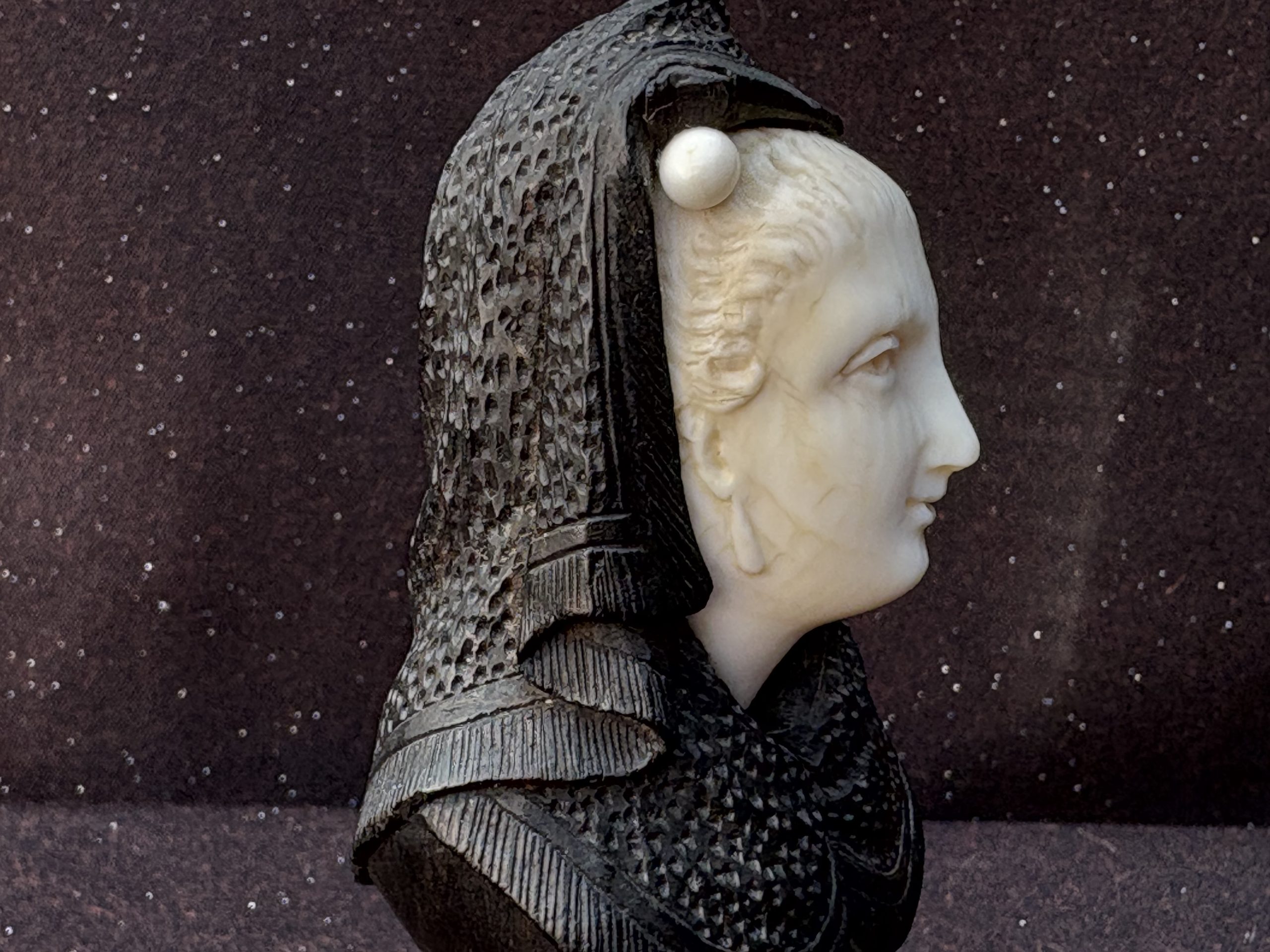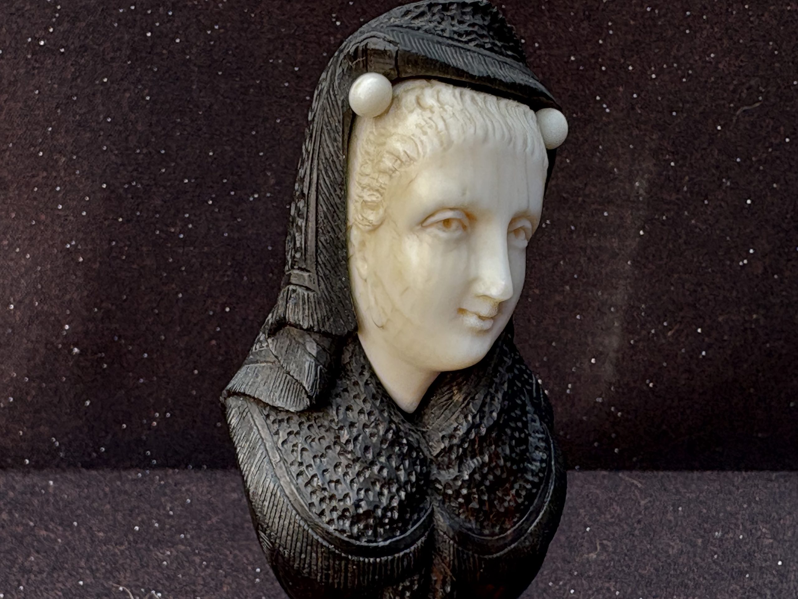 The bust shows a woman with a hood and a richly detailed collar, inspired by historical Renaissance or Baroque fashion. The facial features are finely carved with a soft expression and a carefully worked hairstyle. Small ivory ornaments on the headpiece enhance its decorative character.