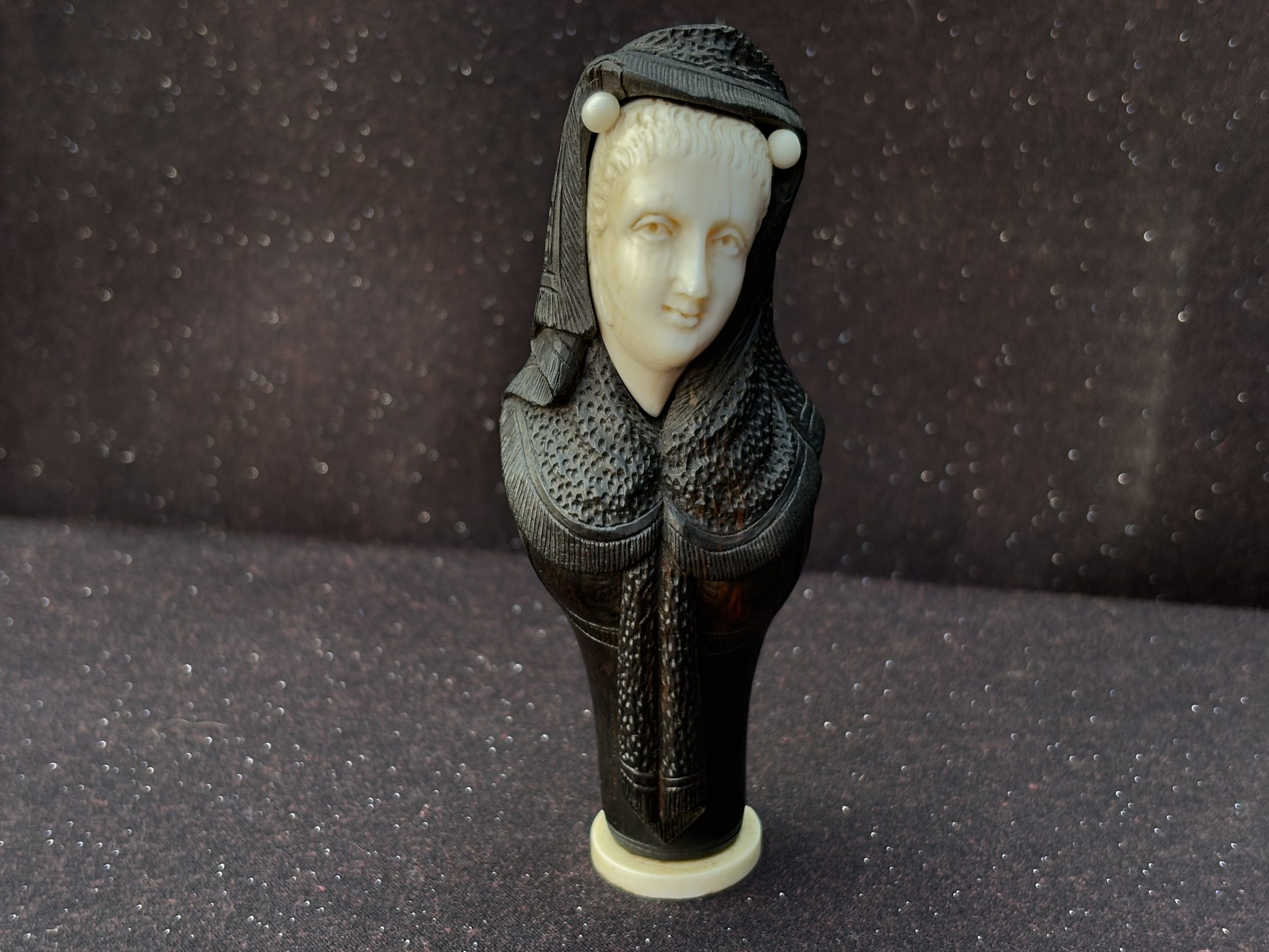 Antique Victorian ivory ladies’ bust on ebony-bodied figure – likely parasol or walking stick handle – England, ca. 1860–1890