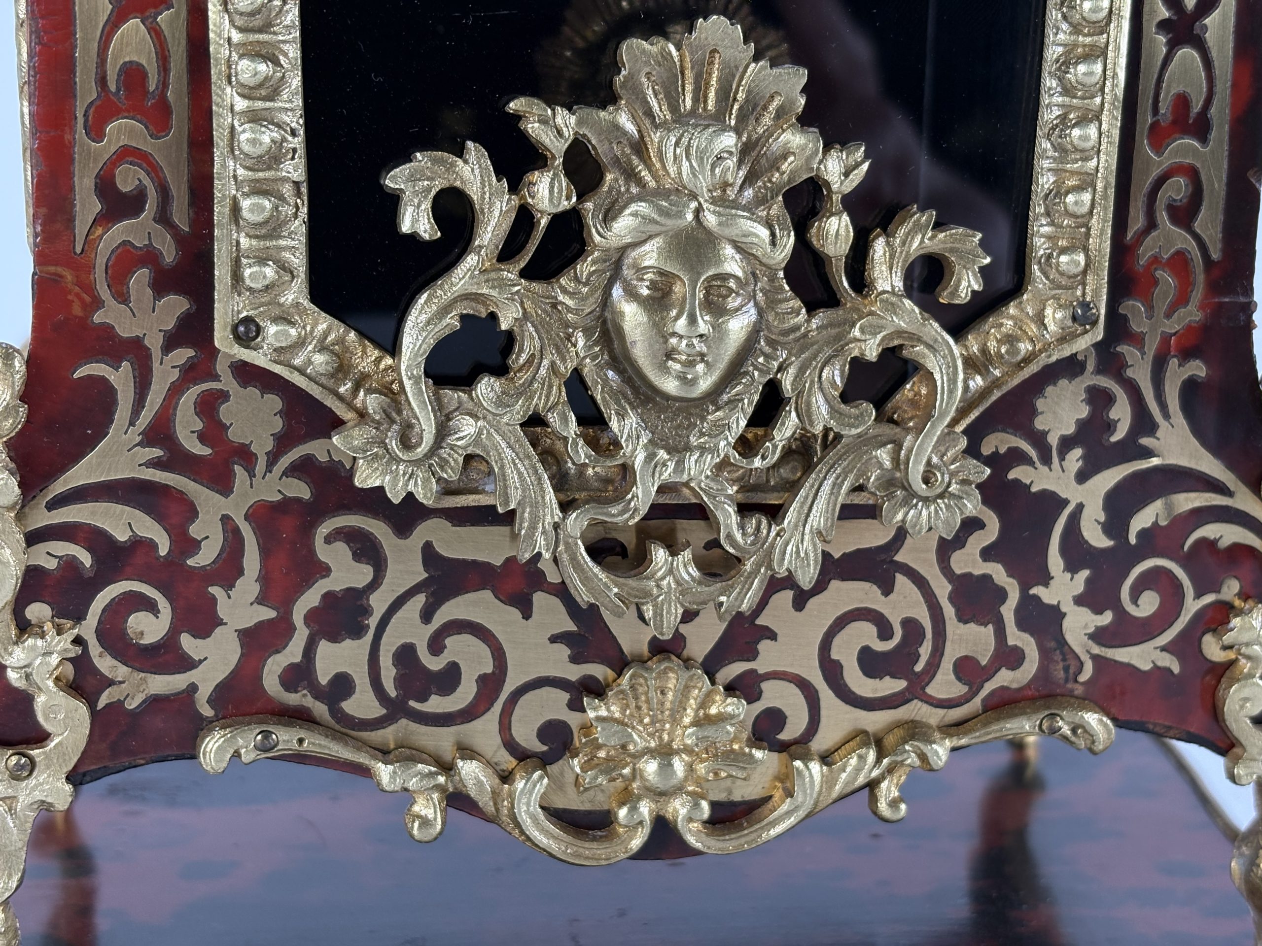Decorative elements: On the obverse is a gilt bronze appliqué with a woman’s mask, possibly a representation of a mythological figure, surrounded by floral and rococo ornaments.