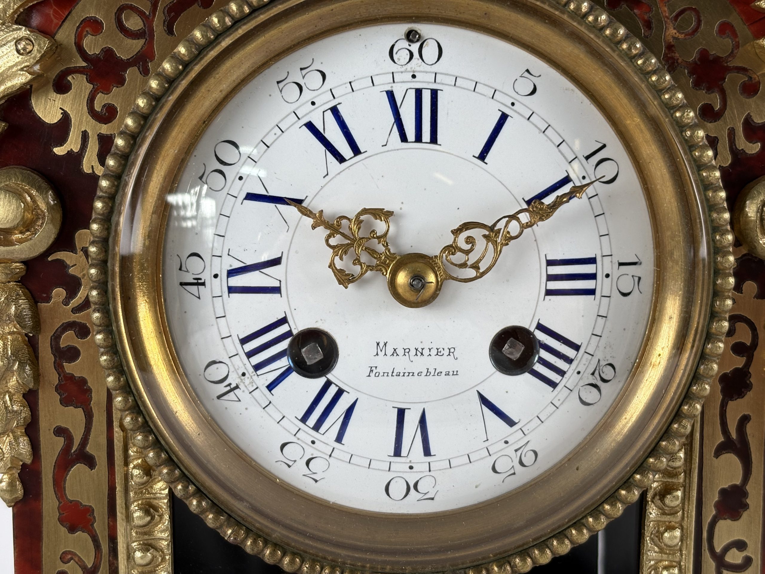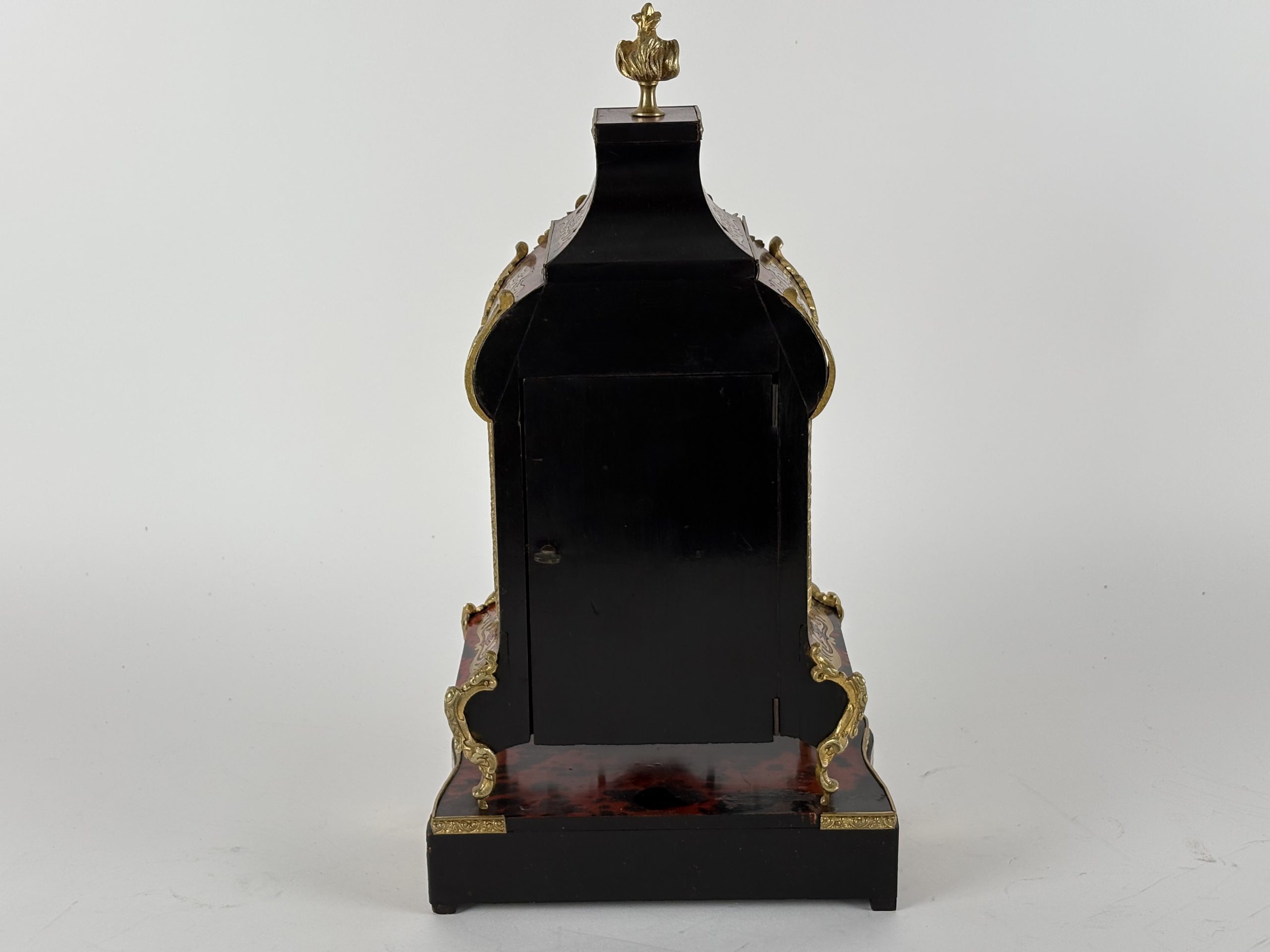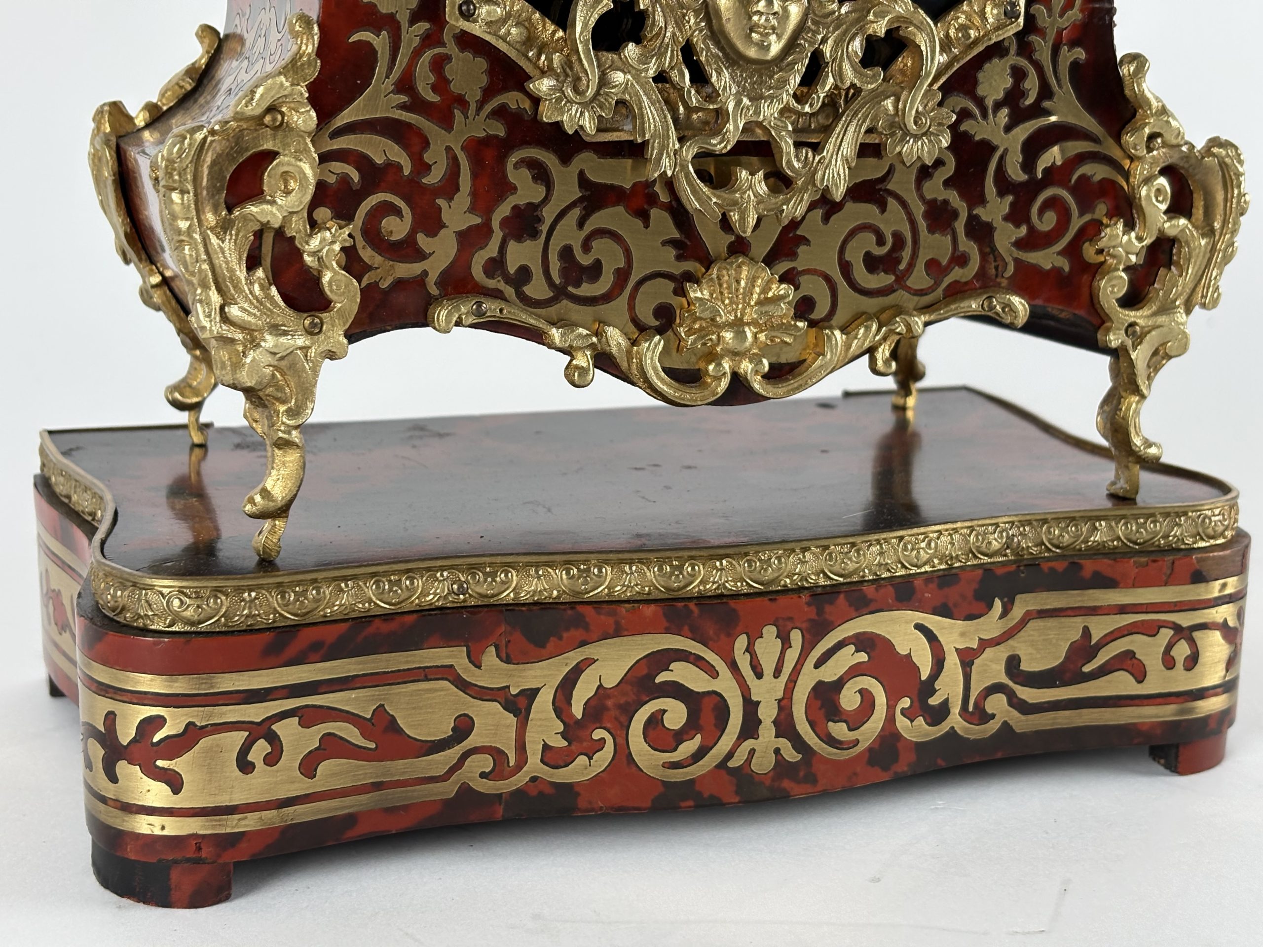 Design and Style: The clock has a classic Boulle style, characterized by red tortoiseshell veneer with inlaid brass. The gilded bronze ornaments give the mantel clock a luxurious look.
