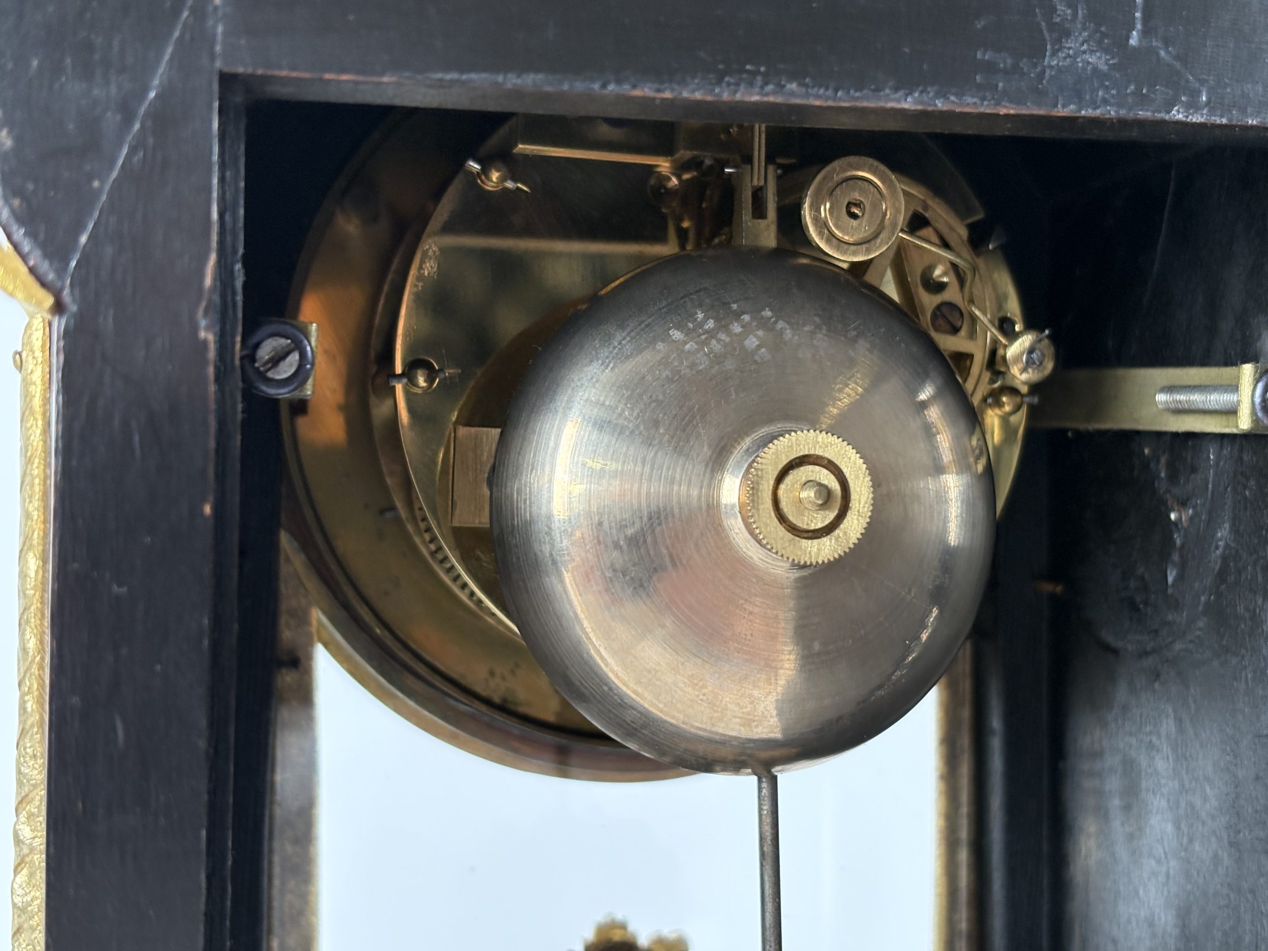 Mechanism: The back shows the movement, with a pendulum and a bell mechanism which strikes every half hour.