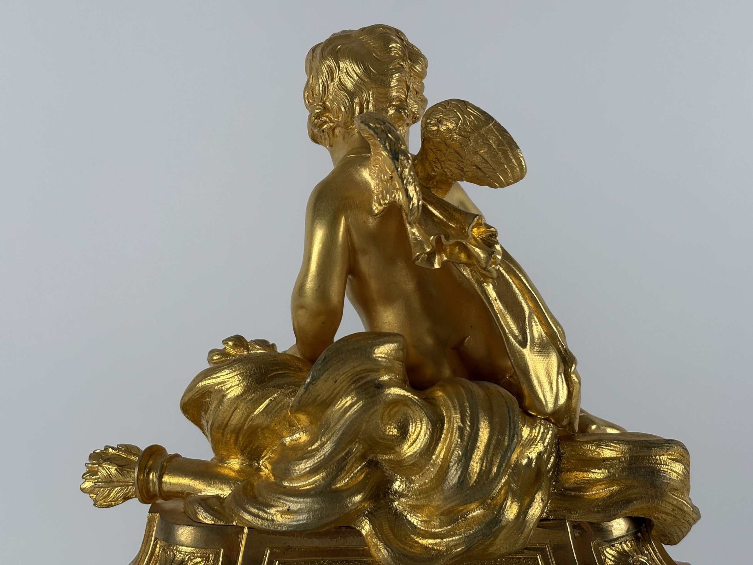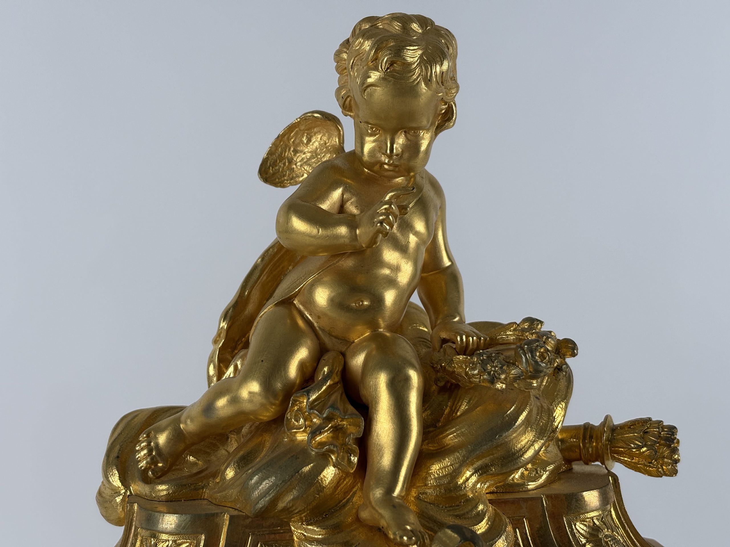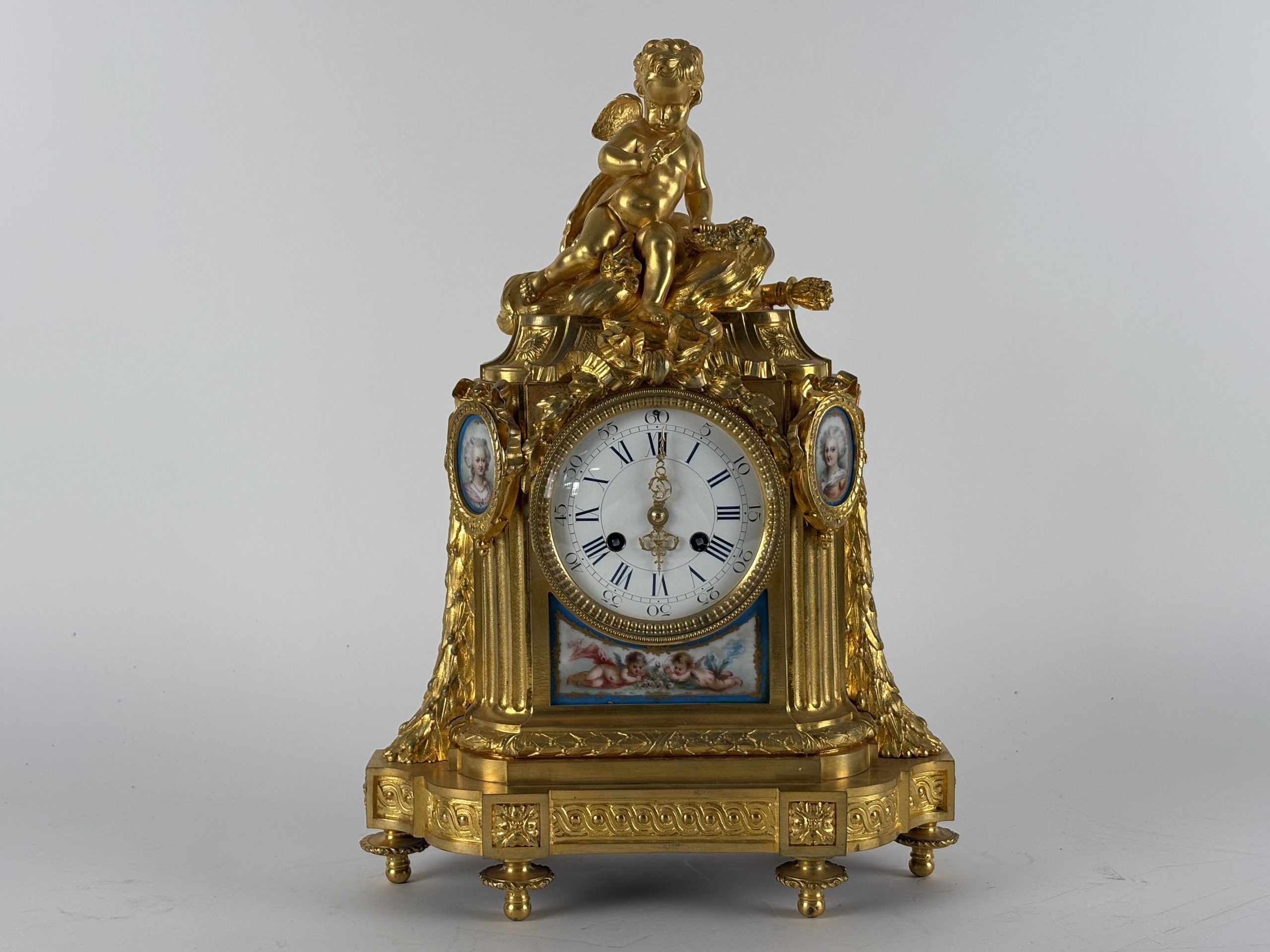 At the top of the mantel clock is a sculpture of a cherub resting on a decorative base element. The clock is further decorated with hand-painted porcelain miniatures, including portraits on the sides and a romantic scene with cherubs under the dial. The dial itself has a classic white background with blue Roman numerals and elegant gold-plated hands.