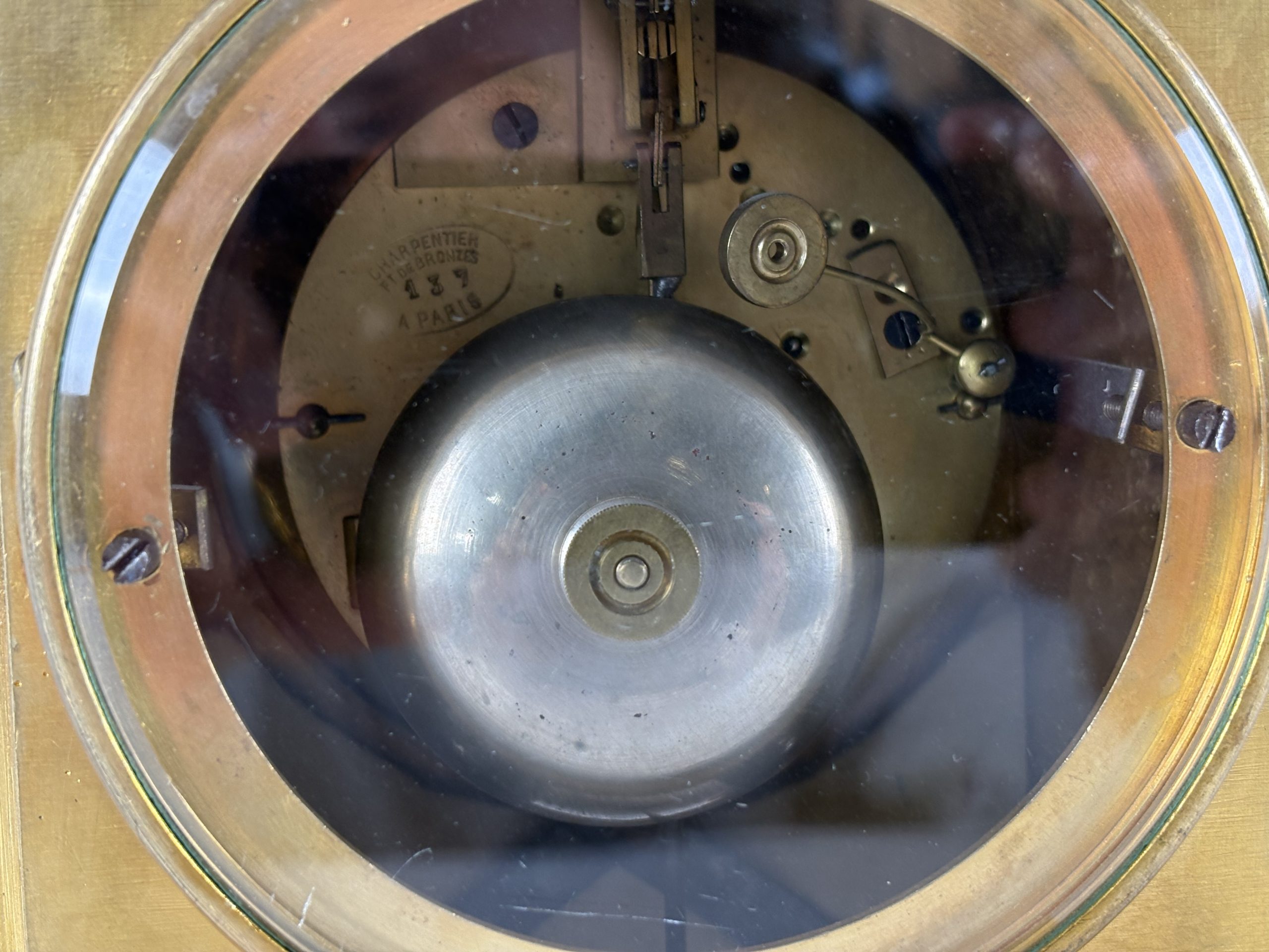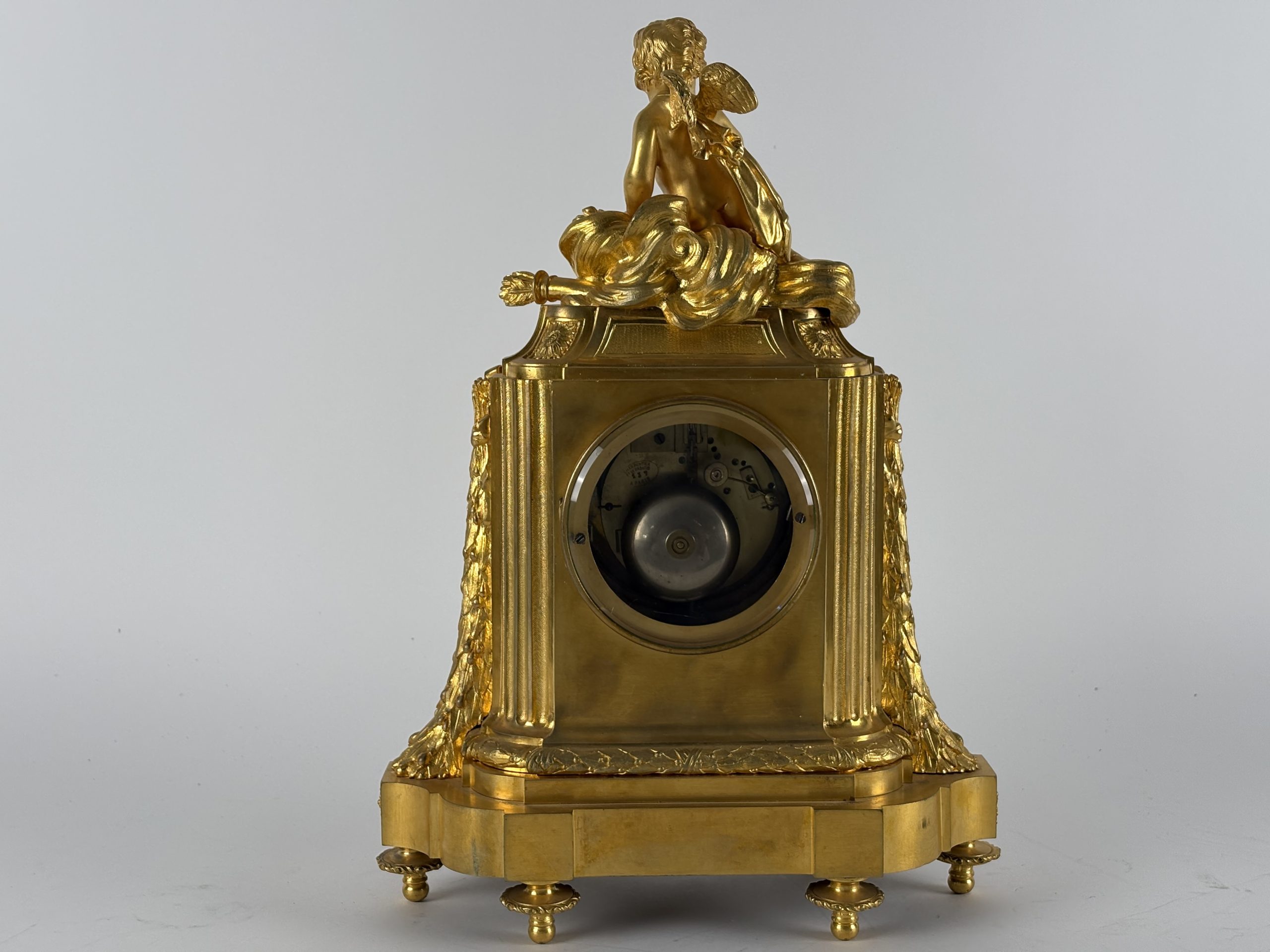 The back of the clock shows the clock mechanism, indicating that this is an original French mantel clock, with a 19th century Parisian movement.